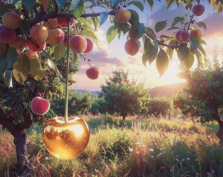 Meine Blicke schweifen in die Ferne der umliegenden Bäume. Sie wachsen an den Säumen, genau dort, wo Wald und Lichtung sich begegnen, während einfallende Sonnenstrahlen so manche besondere Frucht optisch veredeln. Die Pfirsiche vervollständigen die Schönheit der Natur, wie die Form der Struktur eine einzigartige Skulptur. Jeder Pfirsichbaum wirkt für sich allein, als könne er einzigartig naturgeformt und voller Anmut sein.