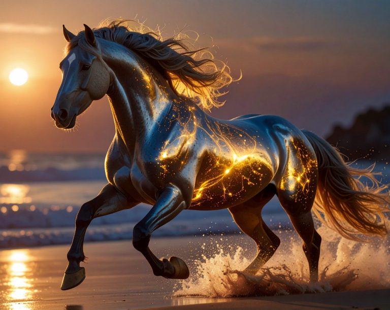 Sobald die Abendsonne erneut die rote Färbung am Himmel zeigt, steht ein besonderes Pferd mit leuchtenden goldenen Mustern bereit. Es scharrt mit einem langen, grazilen Fuß und wartet, bis der Tag die Nacht begrüßt. Wenn Dunkelheit schleichend die Helligkeit umhüllt, werden viele goldene Linien mit einer schimmernden, besonders kraftvollen Energie gefüllt. Während die sich verdunkelnden Schatten nach der Sonne greifen, sind es die golden gemusterten Farben, die weiterhin leuchtend durch die einsetzende Dunkelheit streichen. Die Sonnenstrahlen schleichen im Angesicht des roten Himmels davon, bis vorübergehend die Nacht die Oberhand gewinnt. Es ist die Erkenntnis, dass Zeit nie schneller verrinnt, die immer mitschwingt. Die beständige Vergänglichkeit von Bewusstem und unterbewusstem Erleben tiefer Gefühle kostet dem Verstand kaum Mühe. Das Abendrot schleicht langsam davon und treibt die ruhelosen Schritte des Pferdes endlich voran. Unaufhaltsam graben die festen Hufe sich in den weichen Sand. Der Boden gibt in der festen Bewegung schneller Schritte nach, während das Pferd die Weichheit des Sandes am seidig glatten, blau schimmernden Fell gespürt hat. Für wenige Sekunden schwebt ein weiter Schritt durch den nassen Sand, doch die Leichtigkeit hat nicht auf Dauer Bestand. Fast schwerelos hält die Luft den von Anmut geschmückten Körper des Pferdes für einen Augenblick fest, bevor es durch Anziehung die Schwerelosigkeit verlässt.