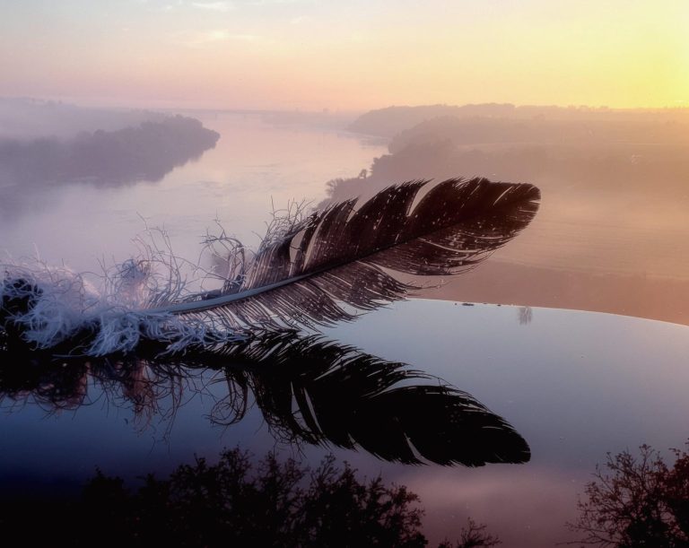 Die Zeit scheint im unsichtbaren Tanz fast stillzustehen, während die Feder dem Boden entgegenfliegt und der prachtvolle Vogel immer weitere Kreise am Himmel zieht. Die Feder sinkt weiter, wiegt kaum mehr als ein Hauch und trägt zugleich den kaum wahrnehmbaren Abtrieb, den sie zum Sinken braucht. Böe um Böe tragen sie lebendige Wünsche leise davon, doch im leisen Raunen hallt ein hoffnungsvoller Unterton. Windwindungen werden im unbegrenzten Raum seufzend stumm, so still, dass selbst eine Böe die schwebend leichte Feder nicht mehr tragen will. Im träumerischen Höhenverlust fragt eine leise Stimme: „Wohin wird mich dieser Flug wohl führen? Werde ich dich weiterhin spüren?“. Der letzte Ton verstummt, während die Feder dem Boden ganz nah entgegen sinkt und zugleich ein glänzendes Licht auf der spiegelnden Wasseroberfläche erglimmt. Sonnenstrahlen erwärmen eine unruhige Wasseroberfläche, die einen langen Fluss wie einen gemusterten Schmuck verziert. Seine Länge reicht bis über den Horizont hinaus, der Wasserfluss hört am Horizont jedoch nicht einfach auf. In einem zaghaften Tanz gleitet die Feder auf das im Sonnenlicht spiegelnde Wasser nieder und findet sich schließlich auf der schimmernden Wasseroberfläche wieder.