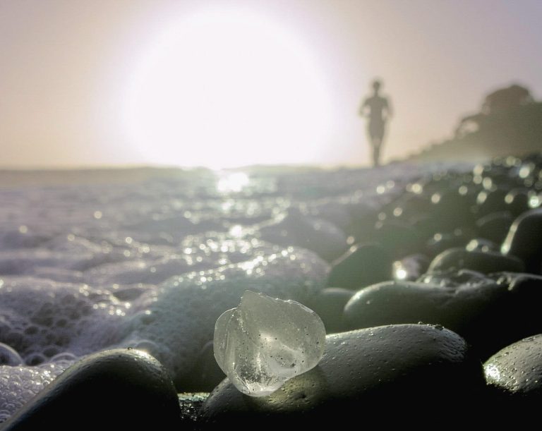 Wellenschwünge spielen eine sanfte Melodie, besonders einzigartige Klänge enden nie. Selbst ihr Gefühl spürt, was sie mit ihren Augen sieht, während durch Knirschen aus Sand und Kies sanftes Knistern in das Lied der Natur einfließt. Gefesselt von ruhigen, beständigen Tönen kann innere Ruhe Zeitdruck verhöhnen. Stille Ordnung spielt die leise Geige der Unvergänglichkeit, die bis in jeden einzelnen Wassertropfen des Meeres reicht. Im Vergleich mit dem ehrlichen Klang der Natur wirken manche Worte umdeutend leer. Ihr Inhalt schafft die Schwelle zur Bedeutsamkeit nicht mehr. Ein Geräusch erklingt, wohltuend und verwirrend zugleich, weshalb ihr Blick suchend über den Boden streicht. Jeder Kieselstein sieht wie der andere aus, scheinbar schafft es keiner, über das einheitlich graue Muster hinaus. Nachdenklich schweift ihr Blick in die Ferne des langen Strandes, am Rand des umliegenden Landes. Etwas Unbekanntes erweckt plötzlich stumme Aufmerksamkeit. Das Wirken leuchtet so sanft, dass es kaum nach Beachtung schreit. Es ist ein kantiger Stein, der auffallend bedeutsam zwischen all den Kieselsteinen scheint. Das trübe, durchscheinende Angesicht erscheint in einem milchig schimmernden Licht. Ungewöhnlich sieht er aus, denn er sticht aus all den Kieselsteinen auffallend in klarer Form heraus.